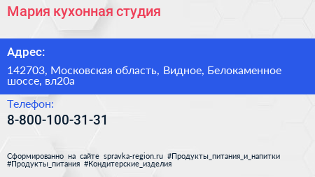 Мария, кухонная студия по адресу 142703, Московская область, Видное, Белокаменное шоссе, вл20а в дальнейшем Организация, размещена в следующих категориях: