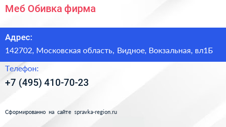 Меб-Обивка, фирма по адресу 142702, Московская область, Видное, Вокзальная, вл1Б в дальнейшем Организация, размещена в следующих категориях: