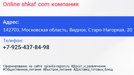 Online-shkaf.com, компания по адресу 142703, Московская область, Видное, Старо-Нагорная, 20 в дальнейшем Организация, размещена в следующих категориях: