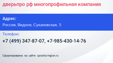 дверьпро.рф, многопрофильная компания по адресу 5, Сухановская улица, Жилой комплекс «Государев дом», Лопатино, Ленинский городской округ, Московская область, Центральный федеральный округ, 142710, Россия в дальнейшем Организация, размещена в следующих категориях:
