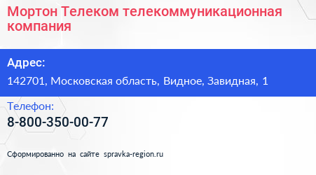 Мортон Телеком, телекоммуникационная компания по адресу 142701, Московская область, Видное, Завидная, 1 в дальнейшем Организация, размещена в следующих категориях: