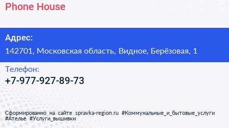 Phone House по адресу 142701, Московская область, Видное, Берёзовая, 1 в дальнейшем Организация, размещена в следующих категориях: