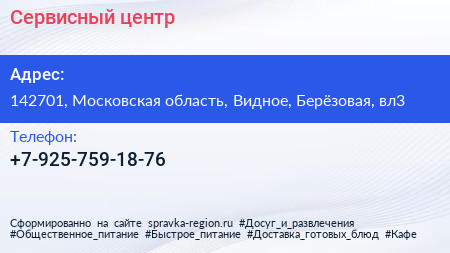 Сервисный центр по адресу 142701, Московская область, Видное, Берёзовая, вл3 в дальнейшем Организация, размещена в следующих категориях: