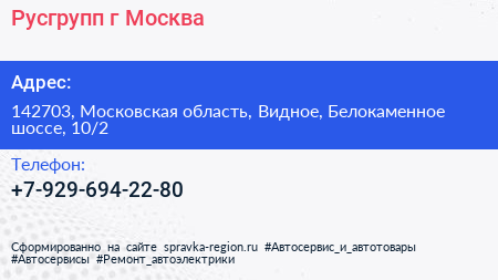 Русгрупп, г. Москва по адресу 142703, Московская область, Видное, Белокаменное шоссе, 10/2 в дальнейшем Организация, размещена в следующих категориях: