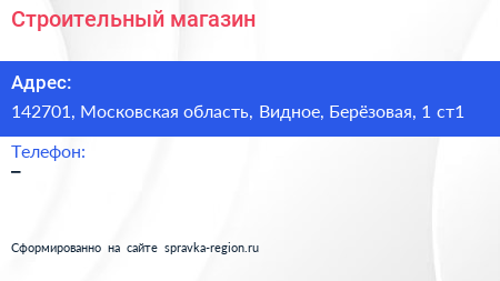 Строительный магазин по адресу 142701, Московская область, Видное, Берёзовая, 1 ст1 в дальнейшем Организация, размещена в следующих категориях: