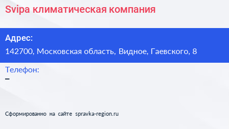 Svipa, климатическая компания по адресу 142700, Московская область, Видное, Гаевского, 8 в дальнейшем Организация, размещена в следующих категориях: