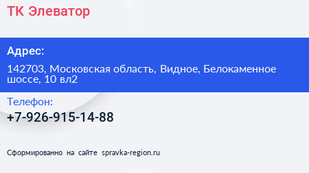 ТК Элеватор по адресу 142703, Московская область, Видное, Белокаменное шоссе, 10 вл2 в дальнейшем Организация, размещена в следующих категориях: