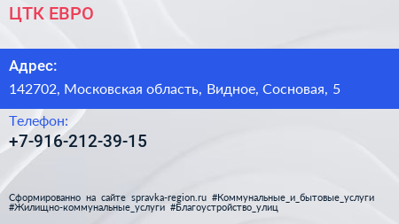 ЦТК-ЕВРО по адресу 142702, Московская область, Видное, Сосновая, 5 в дальнейшем Организация, размещена в следующих категориях: