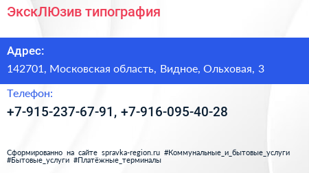 ЭкскЛЮзив, типография по адресу 142701, Московская область, Видное, Ольховая, 3 в дальнейшем Организация, размещена в следующих категориях: