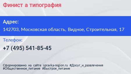 Финист-а, типография по адресу 142703, Московская область, Видное, Строительная, 17 в дальнейшем Организация, размещена в следующих категориях: