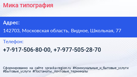 Мика, типография по адресу 142703, Московская область, Видное, Школьная, 77 в дальнейшем Организация, размещена в следующих категориях: