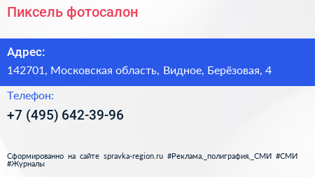 Пиксель, фотосалон по адресу 142701, Московская область, Видное, Берёзовая, 4 в дальнейшем Организация, размещена в следующих категориях: