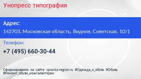 Унопресс, типография по адресу 142703, Московская область, Видное, Советская, 10/1 в дальнейшем Организация, размещена в следующих категориях: