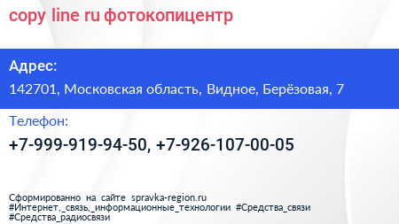copy-line.ru, фотокопицентр по адресу 142701, Московская область, Видное, Берёзовая, 7 в дальнейшем Организация, размещена в следующих категориях: