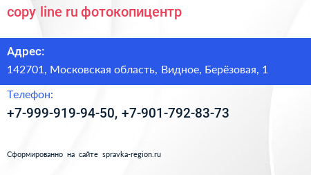 copy-line.ru, фотокопицентр по адресу 142701, Московская область, Видное, Берёзовая, 1 в дальнейшем Организация, размещена в следующих категориях: