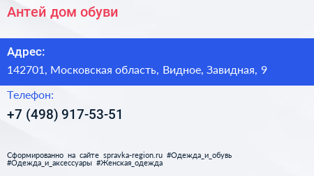 Антей, дом обуви по адресу 142701, Московская область, Видное, Завидная, 9 в дальнейшем Организация, размещена в следующих категориях: