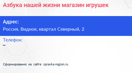 Азбука нашей жизни, магазин игрушек по адресу Торговый центр "ЭкоВидное", 2, квартал Северный, микрорайон Купелинка, 6-й микрорайон, Ленинский городской округ, Московская область, Центральный федеральный округ, 152701, Россия в дальнейшем Организация, размещена в следующих категориях: