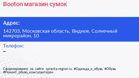 Booton, магазин сумок по адресу 142703, Московская область, Видное, Солнечный микрорайон, 10 в дальнейшем Организация, размещена в следующих категориях: