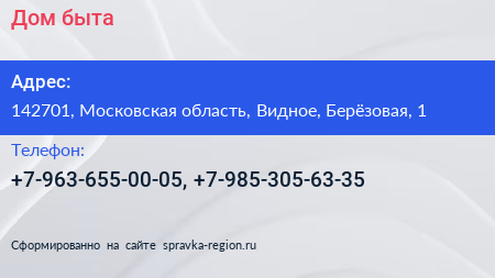 Дом быта по адресу 142701, Московская область, Видное, Берёзовая, 1 в дальнейшем Организация, размещена в следующих категориях: