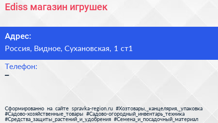 Ediss, магазин игрушек по адресу Аструм, 1 с1, Сухановская улица, Жилой комплекс «Государев дом», Лопатино, Ленинский городской округ, Московская область, Центральный федеральный округ, 142710, Россия в дальнейшем Организация, размещена в следующих категориях:
