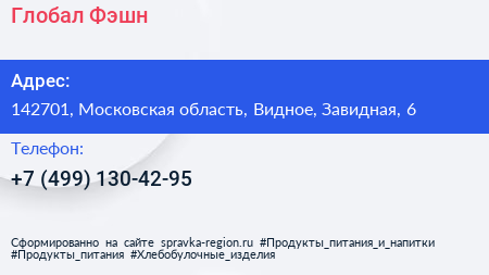 Глобал Фэшн по адресу 142701, Московская область, Видное, Завидная, 6 в дальнейшем Организация, размещена в следующих категориях:
