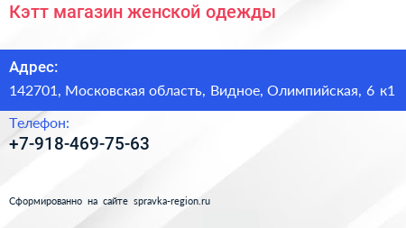 Кэтт, магазин женской одежды по адресу 142701, Московская область, Видное, Олимпийская, 6 к1 в дальнейшем Организация, размещена в следующих категориях: