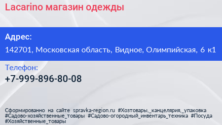 Lacarino, магазин одежды по адресу 142701, Московская область, Видное, Олимпийская, 6 к1 в дальнейшем Организация, размещена в следующих категориях: