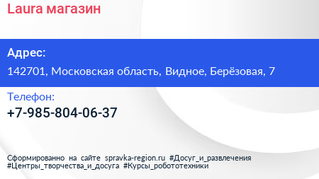 Laura, магазин по адресу 142701, Московская область, Видное, Берёзовая, 7 в дальнейшем Организация, размещена в следующих категориях: