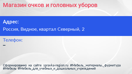 Магазин очков и головных уборов по адресу Торговый центр "ЭкоВидное", 2, квартал Северный, микрорайон Купелинка, 6-й микрорайон, Ленинский городской округ, Московская область, Центральный федеральный округ, 152701, Россия в дальнейшем Организация, размещена в следующих категориях: