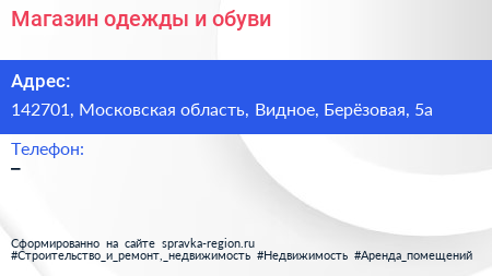 Магазин одежды и обуви по адресу 142701, Московская область, Видное, Берёзовая, 5а в дальнейшем Организация, размещена в следующих категориях: