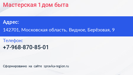 Мастерская №1, дом быта по адресу 142701, Московская область, Видное, Берёзовая, 9 в дальнейшем Организация, размещена в следующих категориях: