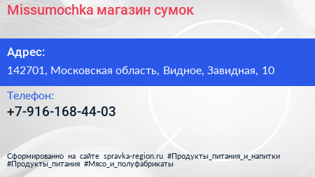 Missumochka, магазин сумок по адресу 142701, Московская область, Видное, Завидная, 10 в дальнейшем Организация, размещена в следующих категориях: