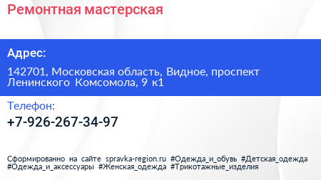 Ремонтная мастерская по адресу 142701, Московская область, Видное, проспект Ленинского Комсомола, 9 к1 в дальнейшем Организация, размещена в следующих категориях: