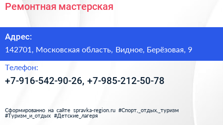 Ремонтная мастерская по адресу 142701, Московская область, Видное, Берёзовая, 9 в дальнейшем Организация, размещена в следующих категориях: