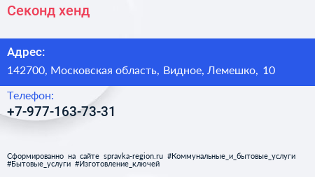 Секонд-хенд по адресу 142700, Московская область, Видное, Лемешко, 10 в дальнейшем Организация, размещена в следующих категориях: