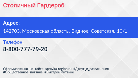Столичный Гардероб по адресу 142703, Московская область, Видное, Советская, 10/1 в дальнейшем Организация, размещена в следующих категориях: