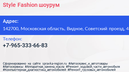 Style Fashion, шоурум по адресу 142700, Московская область, Видное, Советский проезд, 4 в дальнейшем Организация, размещена в следующих категориях: