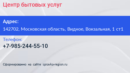 Центр бытовых услуг по адресу 142702, Московская область, Видное, Вокзальная, 1 ст1 в дальнейшем Организация, размещена в следующих категориях: