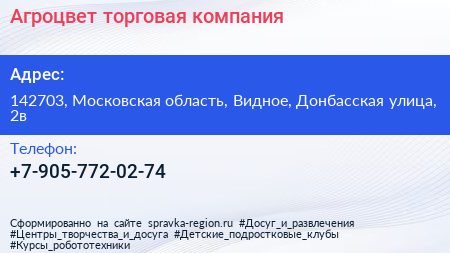 Агроцвет, торговая компания по адресу 142703, Московская область, Видное, Донбасская улица, 2в в дальнейшем Организация, размещена в следующих категориях: