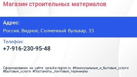 Магазин строительных материалов по адресу 15, Солнечный бульвар, Жилой комплекс «Государев дом», Лопатино, Ленинский городской округ, Московская область, Центральный федеральный округ, 142710, Россия в дальнейшем Организация, размещена в следующих категориях:
