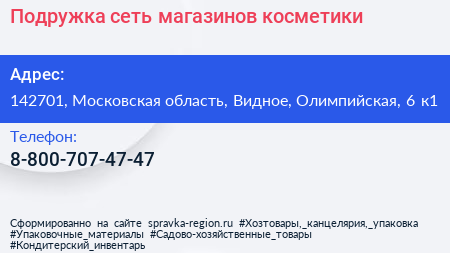 Подружка, сеть магазинов косметики по адресу 142701, Московская область, Видное, Олимпийская, 6 к1 в дальнейшем Организация, размещена в следующих категориях: