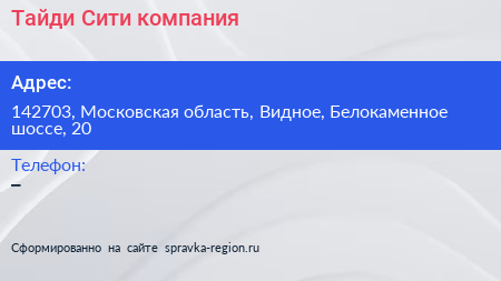 Тайди-Сити, компания по адресу 142703, Московская область, Видное, Белокаменное шоссе, 20 в дальнейшем Организация, размещена в следующих категориях: