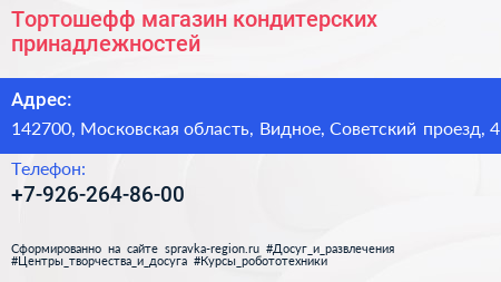 Тортошефф, магазин кондитерских принадлежностей по адресу 142700, Московская область, Видное, Советский проезд, 4 в дальнейшем Организация, размещена в следующих категориях: