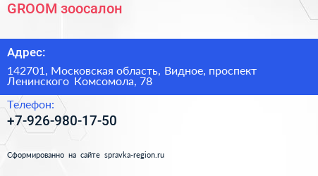 GROOM, зоосалон по адресу 142701, Московская область, Видное, проспект Ленинского Комсомола, 78 в дальнейшем Организация, размещена в следующих категориях:
