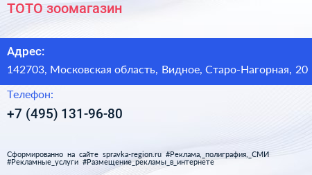 ТОТО, зоомагазин по адресу 142703, Московская область, Видное, Старо-Нагорная, 20 в дальнейшем Организация, размещена в следующих категориях:
