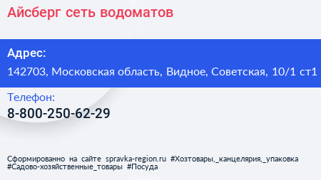 Айсберг, сеть водоматов по адресу 142703, Московская область, Видное, Советская, 10/1 ст1 в дальнейшем Организация, размещена в следующих категориях: