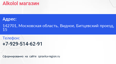 Alkolol, магазин по адресу 142701, Московская область, Видное, Битцевский проезд, 15 в дальнейшем Организация, размещена в следующих категориях: