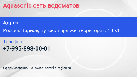 Aquasonic, сеть водоматов по адресу Торговый центр "Мармелад", 18 к1, Жилой комплекс «Бутово-Парк», Бутово, Новодрожжино, Ленинский городской округ, Московская область, Центральный федеральный округ, 142718, Россия в дальнейшем Организация, размещена в следующих категориях: