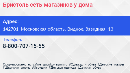 Бристоль, сеть магазинов у дома по адресу 142701, Московская область, Видное, Завидная, 13 в дальнейшем Организация, размещена в следующих категориях: