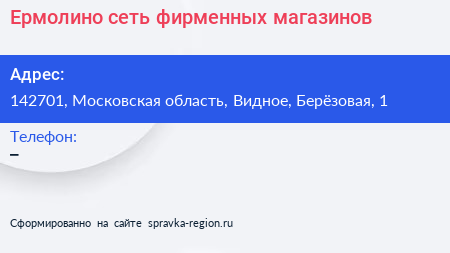 Ермолино, сеть фирменных магазинов по адресу 142701, Московская область, Видное, Берёзовая, 1 в дальнейшем Организация, размещена в следующих категориях:
